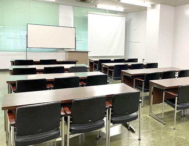 ホワイトボード(1台)、教卓(1台)、長机(8脚)、椅子(24脚)、スクリーン(1台)